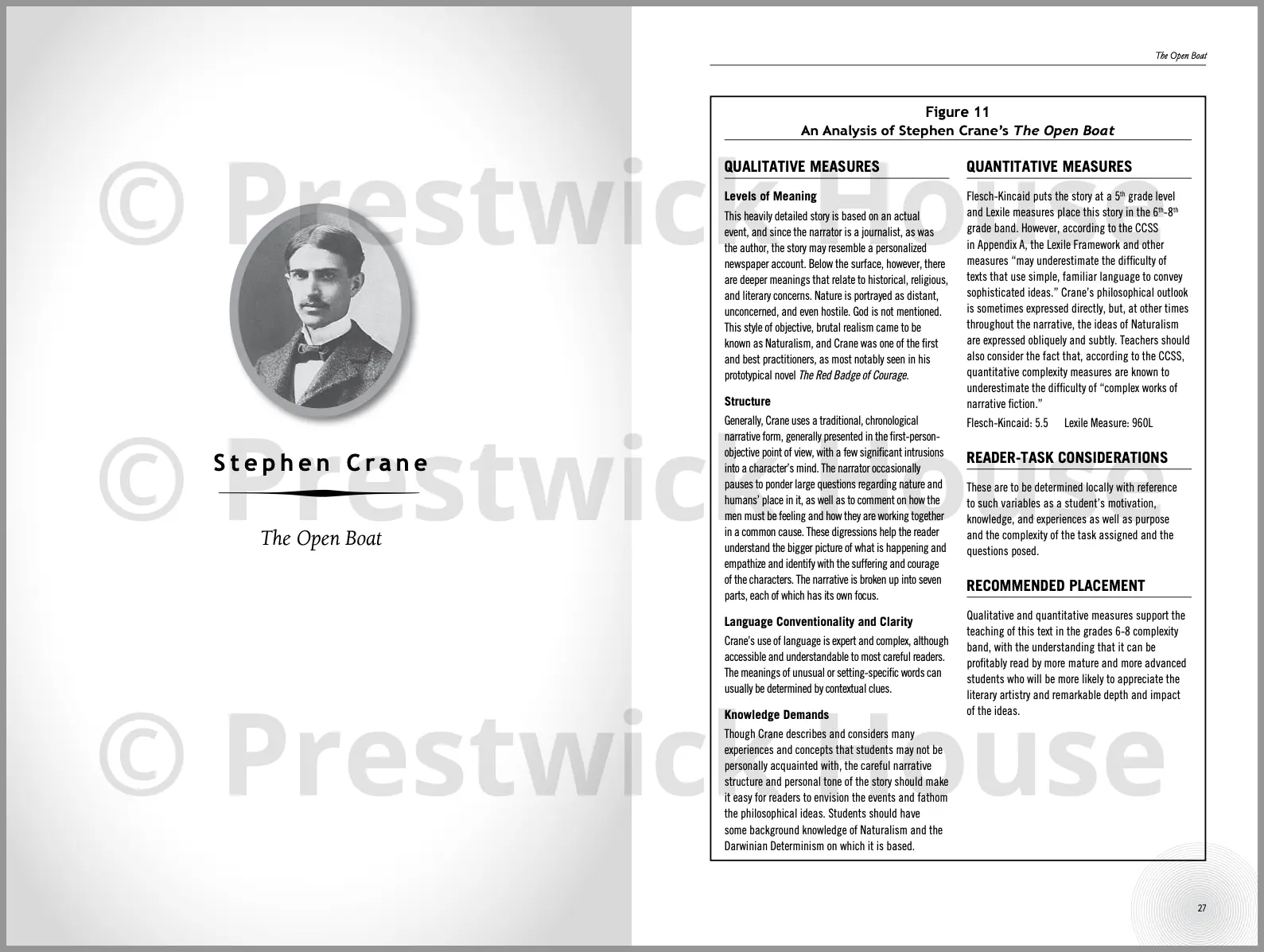 In the Teacher’s Edition, each reading selection begins with a quick analysis of its complexity, making it easy for you to decide if it’s the right difficulty level for your students. An example explanation for Stephen Crane’s “The Open Boat” is below: