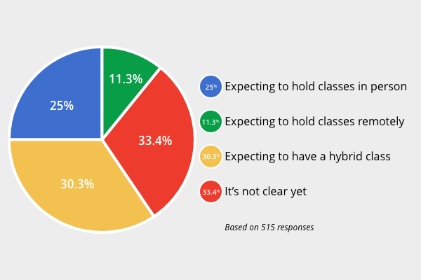 According to our survey, approximately 33.4% of respondents do not have clear reopening plans at present. 30.3% said there will be a hybrid plan in place to limit in-person attendance. 25% of respondents are expecting to hold all classes in person, while 11.3% are expecting to hold all classes remotely.