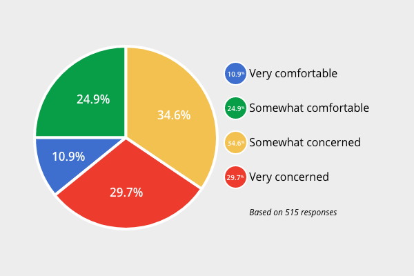 Responses regarding teachers’ comfort levels about their school’s reopening plan were mixed. Overall, 29.7% of teachers were very concerned, 34.6% were somewhat concerned, 24.9% were somewhat comfortable, and 10.9% were very comfortable.