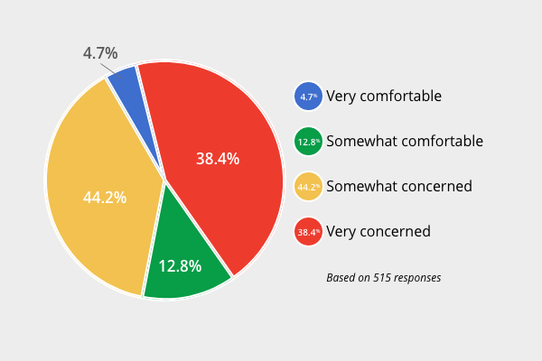 For reopening plans that aren’t clear yet, 38.4% of teachers were very concerned, 44.2% were somewhat concerned, 12.8% were somewhat comfortable, and 4.7% were very comfortable.