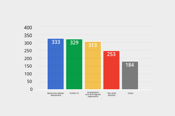 Most teachers, 333 respondents, said they plan on addressing the Black Lives Matter movement at some point during the school year. Following closely behind were the COVID-19 pandemic (329 responses), immigration and the migrant experience (313 responses), and the 2020 election season (253 responses).